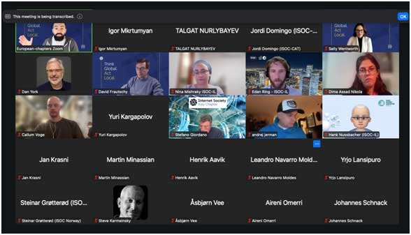 Representatives from the following ISOC Chapters participated in the call: Spain Canary Islands, Georgia, Estonia, Switzerland, Romania, Ukraine, the Netherlands, Spain Aragon, Germany, Slovenia, Belgium, UK England, Poland, Finland, Spain Catalonia, Armenia, Israel, Turkey, Norway, Bosnia & Herzegovina, Sweden, Kazakhstan, Portugal, and Bulgaria.